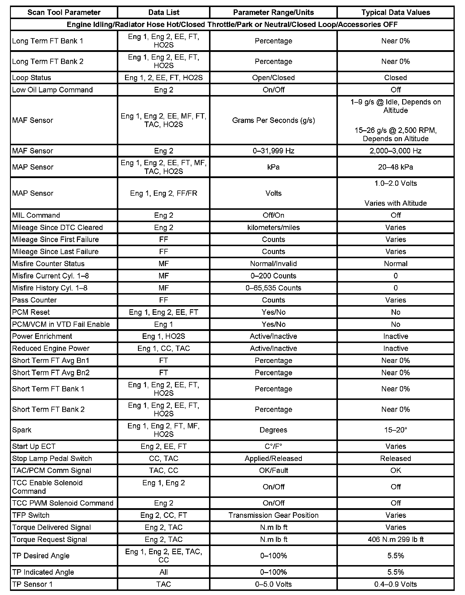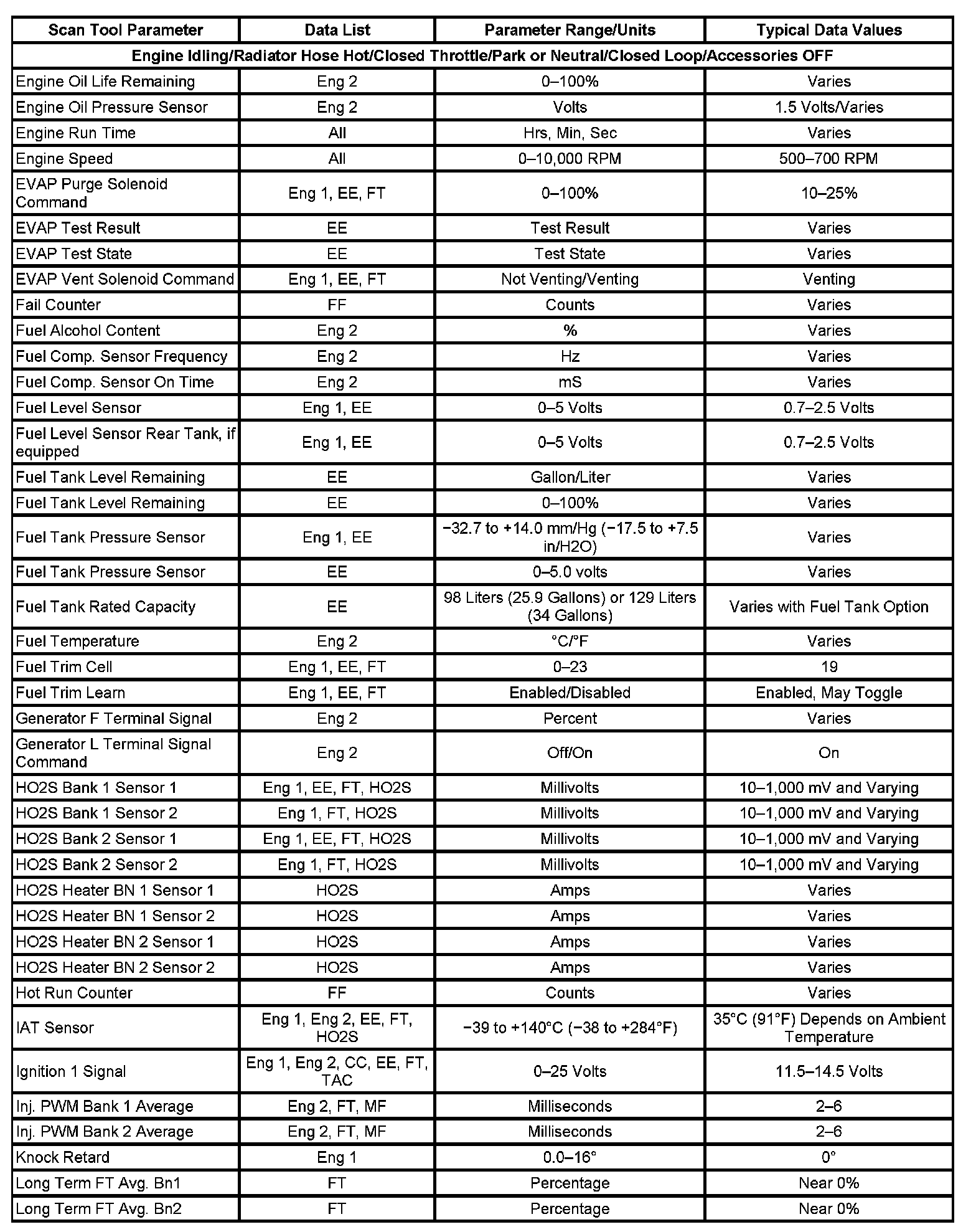 The Engine Scan Tool Data List contains all engine related parameters that are available on the scan tool. The list is arranged in alphabetical order. A given parameter may appear in any one of the data lists, and in some cases may appear more than once, or in more than one data list in order to group certain related parameters together.