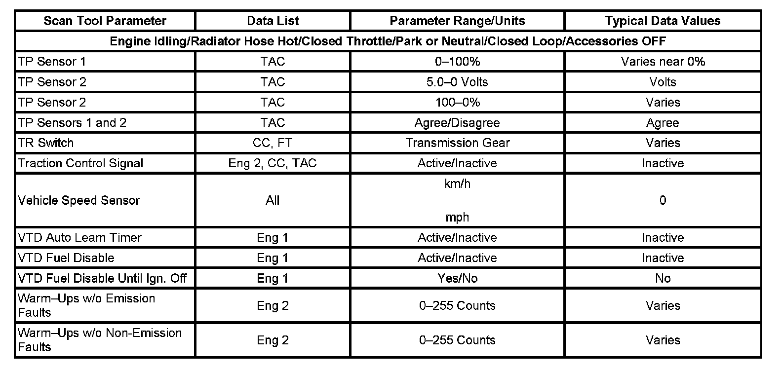 Scan tool values from a properly running engine may be used for comparison with the engine you are diagnosing. The Engine Scan Tool Data List represents values that would be seen on a normal running engine.