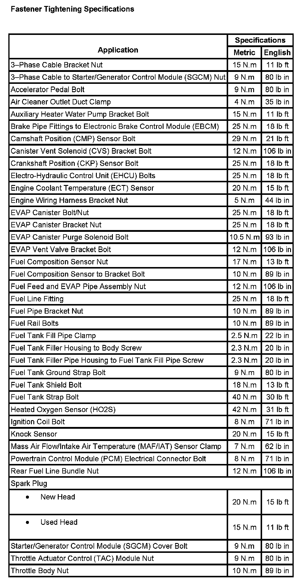 Fastener Tightening Specifications: