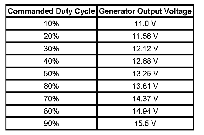 The generator battery control module monitors the generator performance though the generator field duty cycle signal circuit, the generator field control circuit, and the battery positive voltage circuit. The generator battery control module controls the generator through the generator field control, charge indicator control, circuit. The signal is a 5-volt pulse width modulation (PWM) signal of 128 Hz ± 5 percent with a duty cycle of 0-100 percent. The duty cycle sent by the generator battery control module is limited between 36-90 percent. When the engine is turned OFF, the module will send 0 percent duty cycle, low voltage. When there is loss of class 2 communication with the powertrain control module (PCM), the module will send 100 percent duty cycle, 13.8 volts. The table shows the commanded duty cycle and output voltage of the generator.