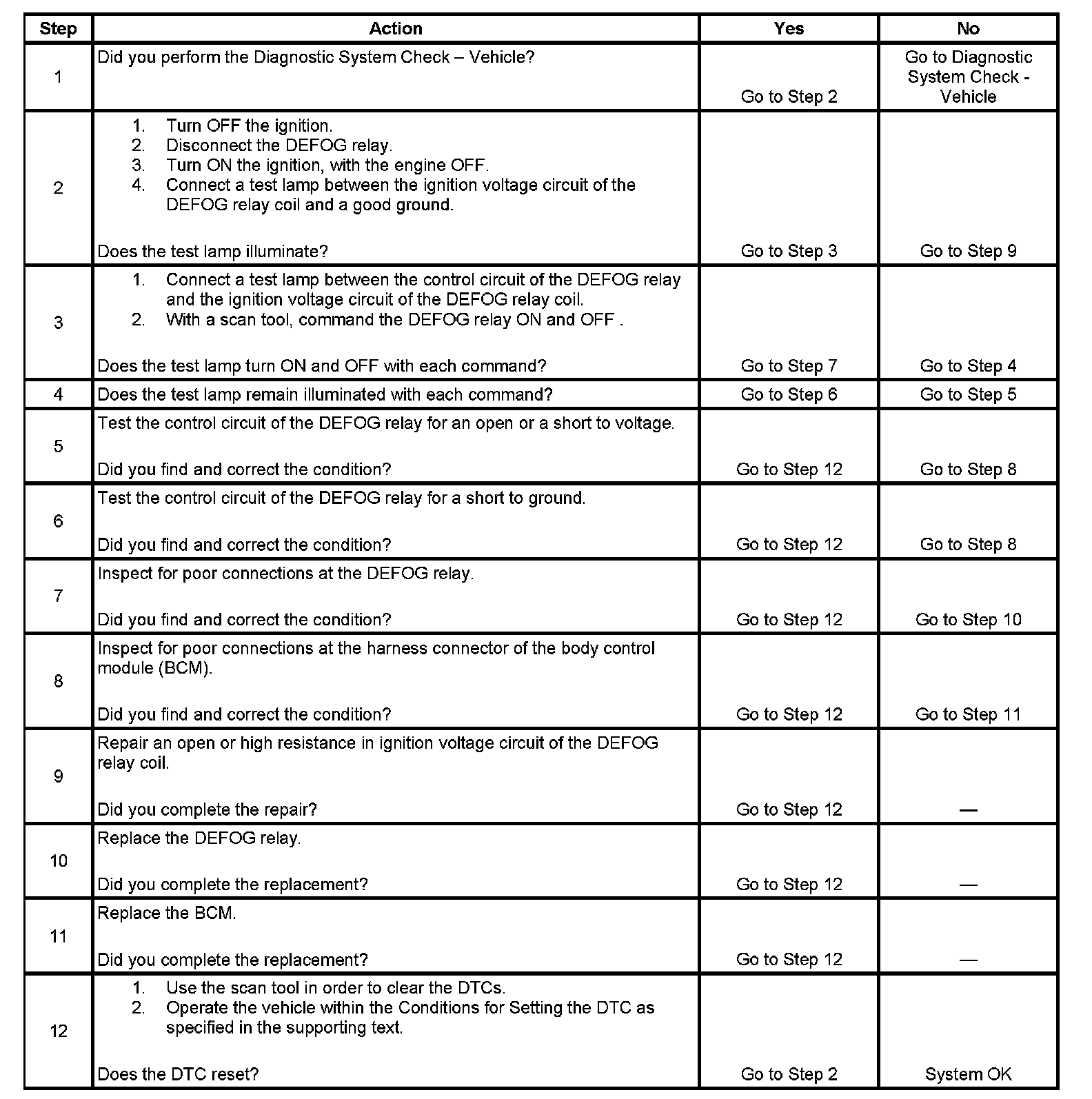 - The BCM detects a low voltage level or an open on the control circuit of the DEFOG relay, while the relay is not energized.