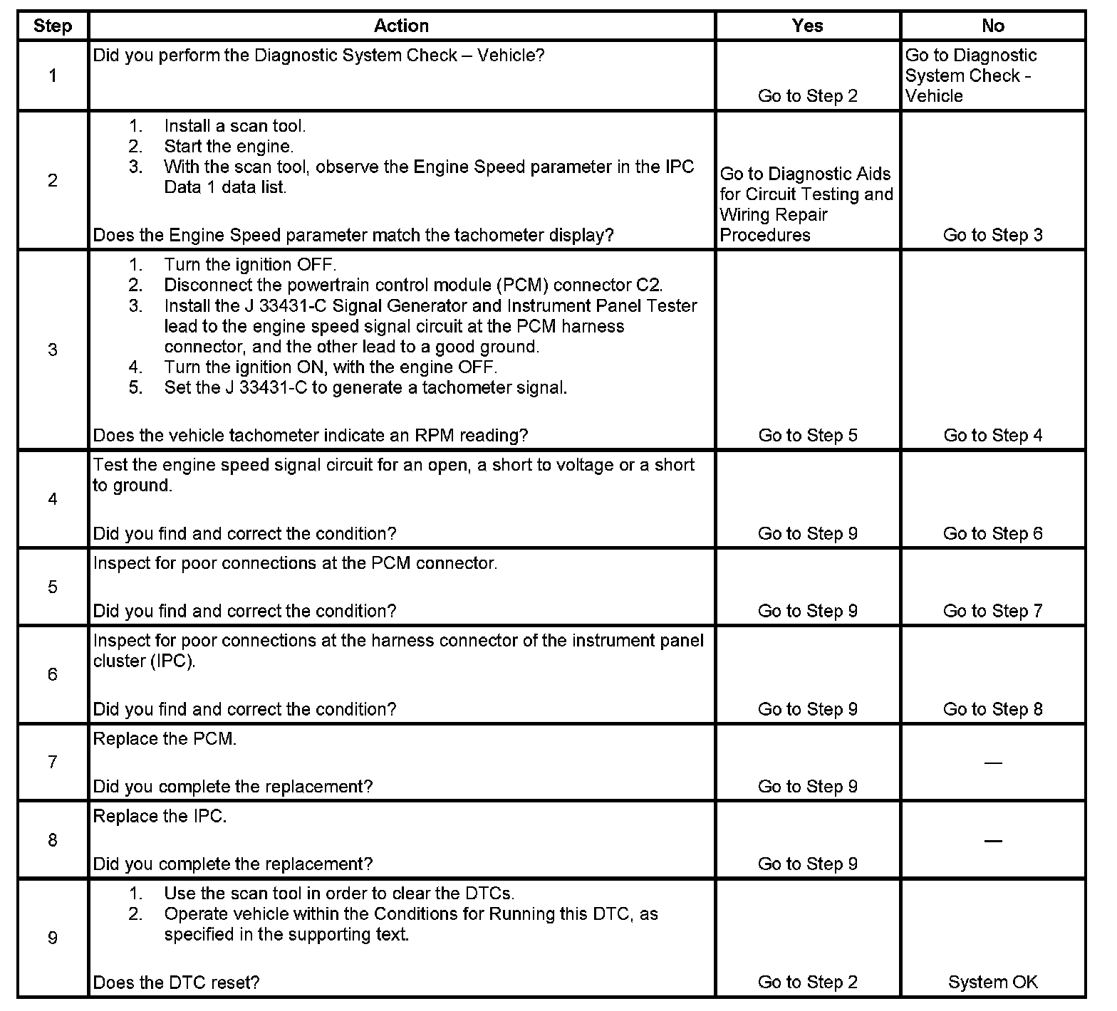 The instrument panel cluster (IPC) monitors the engine speed signal to determine the tachometer position. If the IPC determines the engine speed signal voltage is out of the normal operating range, a DTC will set.