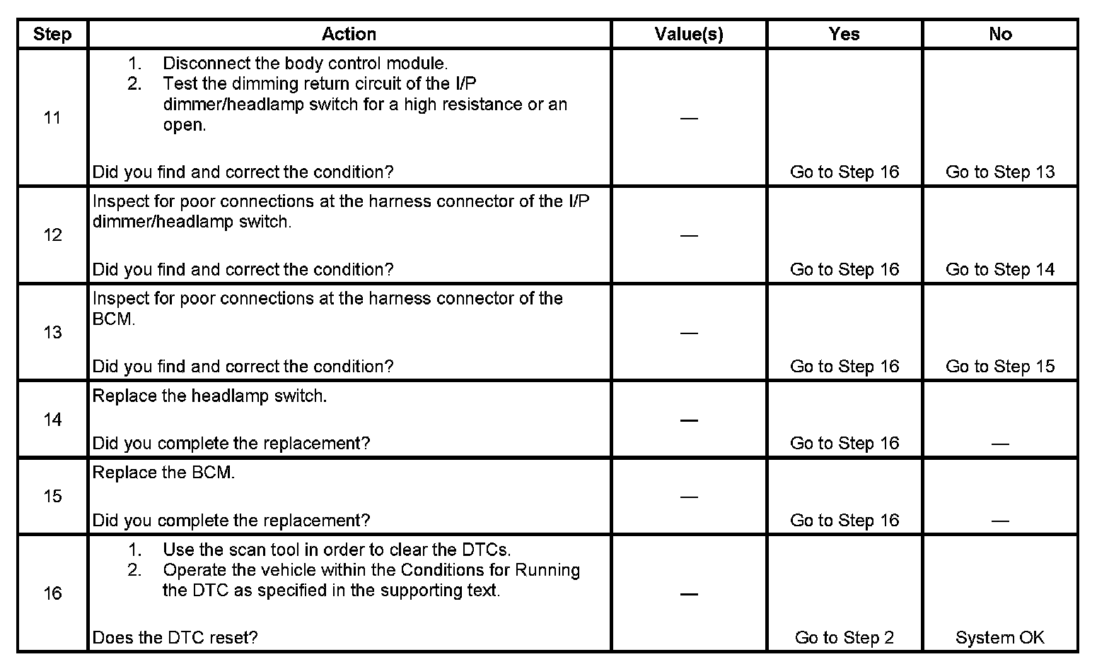 6. This step tests for a high resistance or an open in the dimming return circuit.
