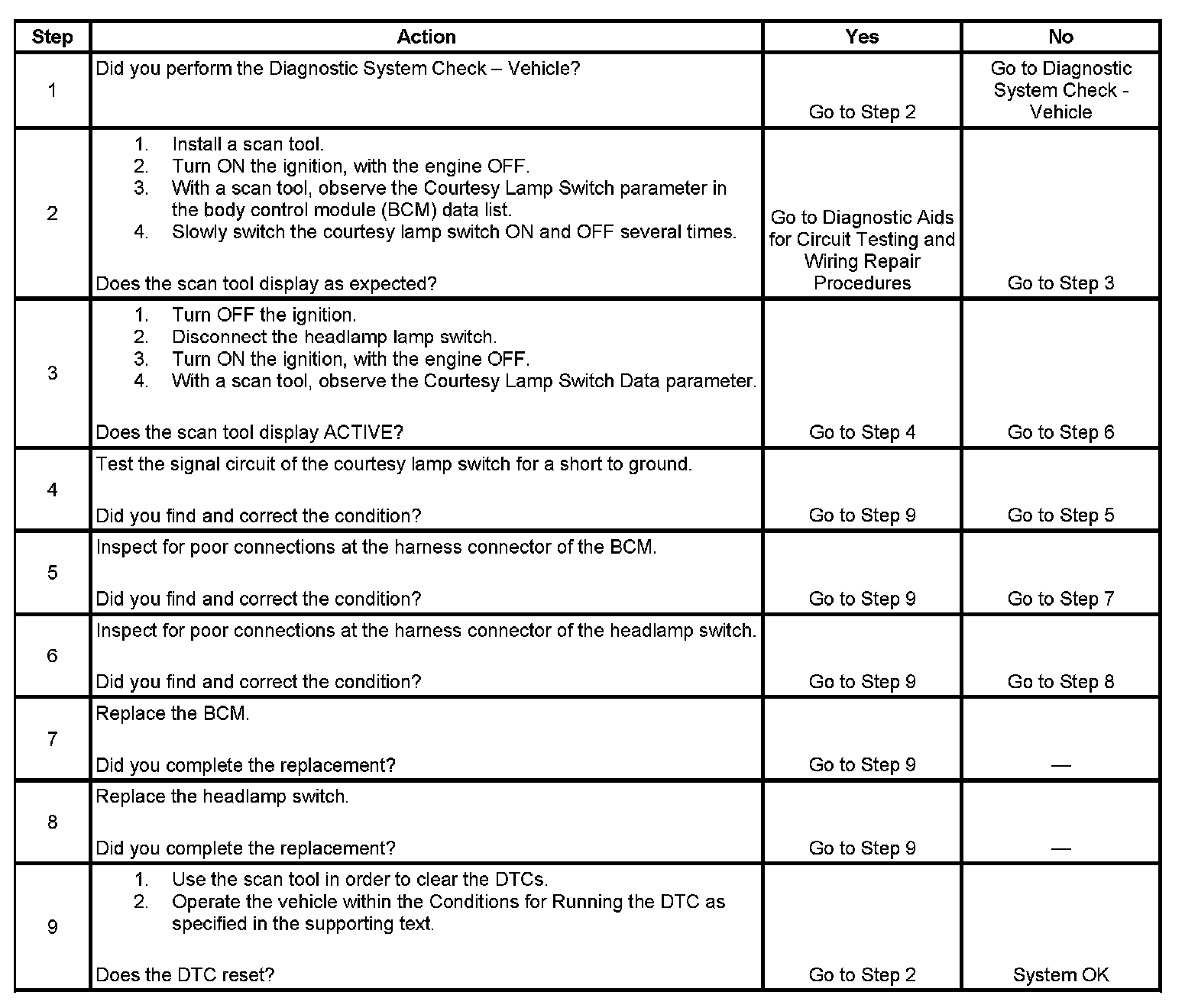 The body control module (BCM) monitors the courtesy lamp switch signal circuit in order to determine when the courtesy/dome lamps should be illuminated. When the BCM senses that the courtesy lamp switch signal circuit is grounded when the switch is activated, the BCM will illuminate the courtesy/dome lamps.