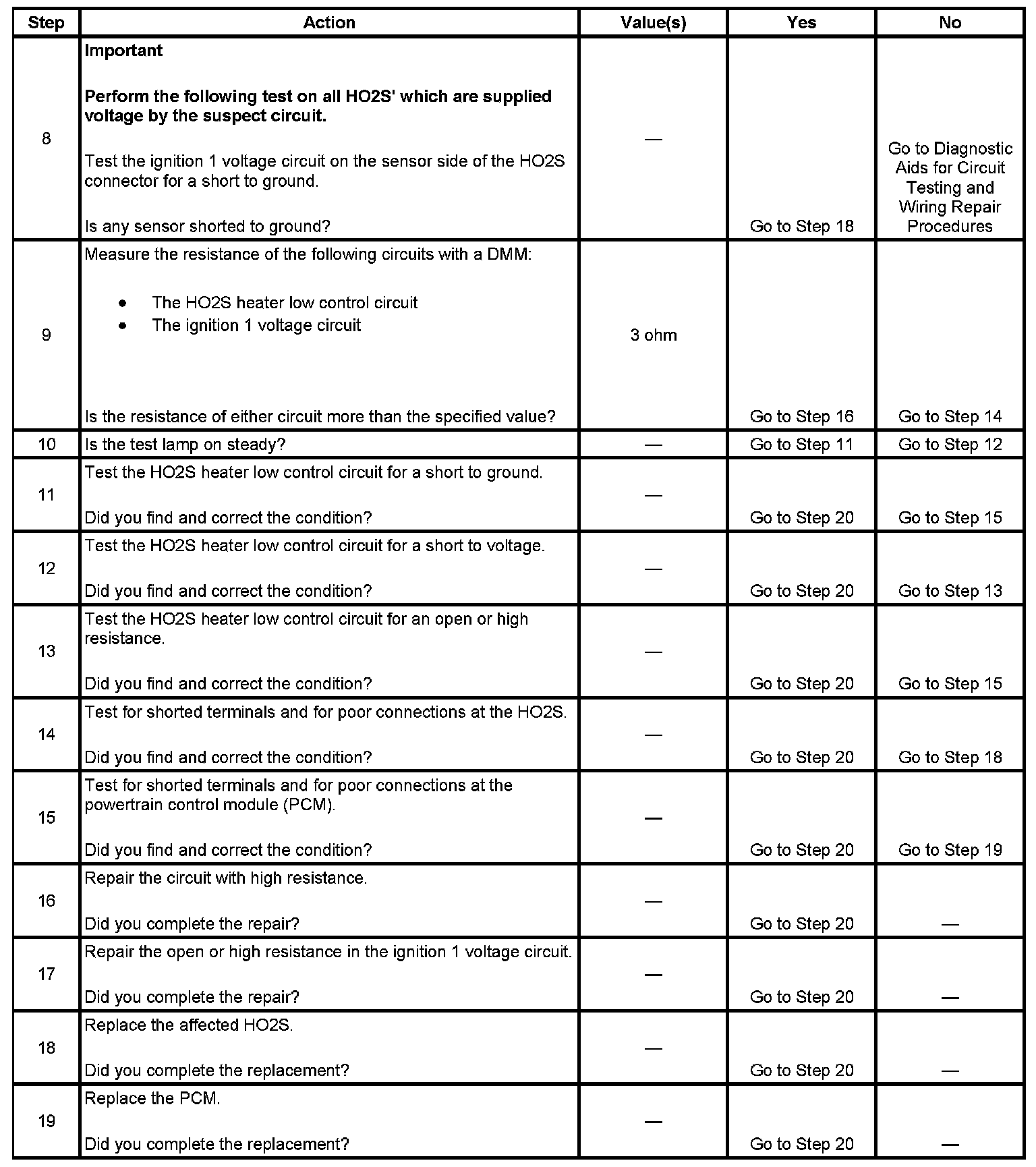 The heated oxygen sensor (HO2S) must reach operating temperature to provide an accurate voltage signal. A heating element inside the HO2S minimizes the time required for the sensor to reach operating temperature. Voltage is provided to the heater by the ignition 1 voltage circuit through a fuse. With the engine running, ground is provided to the heater by the HO2S heater low control circuit, through a low side driver within the powertrain control module (PCM). The PCM commands the heater ON or OFF to maintain a specific HO2S operating temperature range. The PCM determines the temperature by measuring the current flow through the heater. When the heater is in the ON state, the PCM will pulse the heater OFF for a duration of 50 ms, once per second. When the heater is in the OFF state, the PCM will pulse the heater ON for a duration of 50 ms, once per second. The PCM calculates the heater resistance on a cold start. This diagnostic will only run once per ignition cycle. If the PCM detects that the heater calculated resistance is not within an expected range, DTC P0054 sets for HO2S bank 1 sensor 2, or DTC P0060 sets for HO2S bank 2 sensor 2.