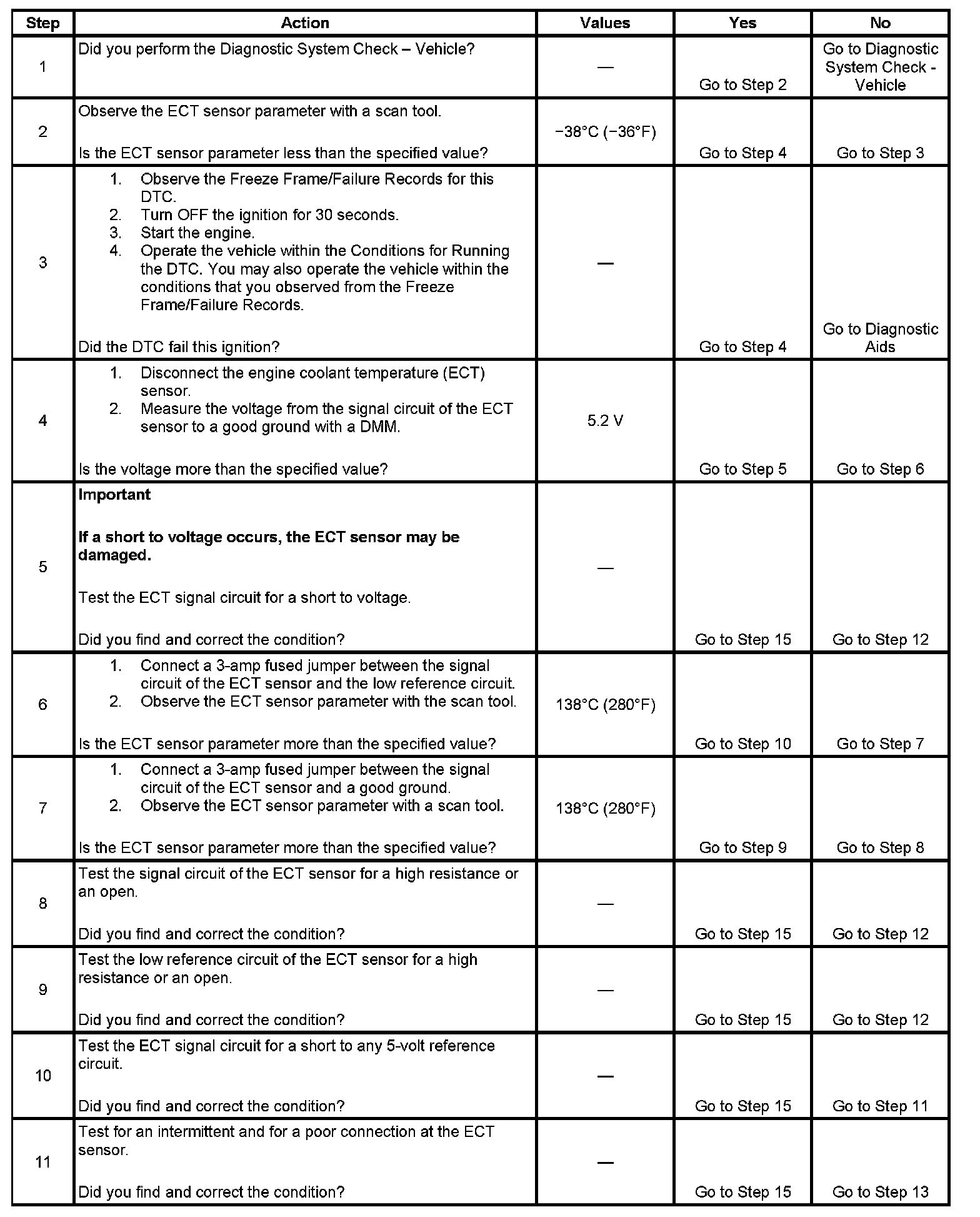 The engine coolant temperature (ECT) sensor is a variable resistor, that measures the temperature of the engine coolant. The ECT sensor has a signal circuit and a low reference circuit. The powertrain control module (PCM) supplies 5 volts to the ECT signal circuit and a ground for the ECT low reference circuit. When the ECT is cold, the sensor resistance is high. When the ECT increases, the sensor resistance decreases. With high sensor resistance, the PCM detects a high voltage on the ECT signal circuit. With lower sensor resistance, the PCM detects a lower voltage on the ECT signal circuit. If the PCM detects an excessively high ECT signal voltage, which is a low temperature indication, DTC P0118 sets.