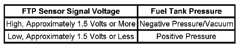 The table illustrates the relationship between FTP sensor signal voltage and the EVAP system pressure/vacuum.