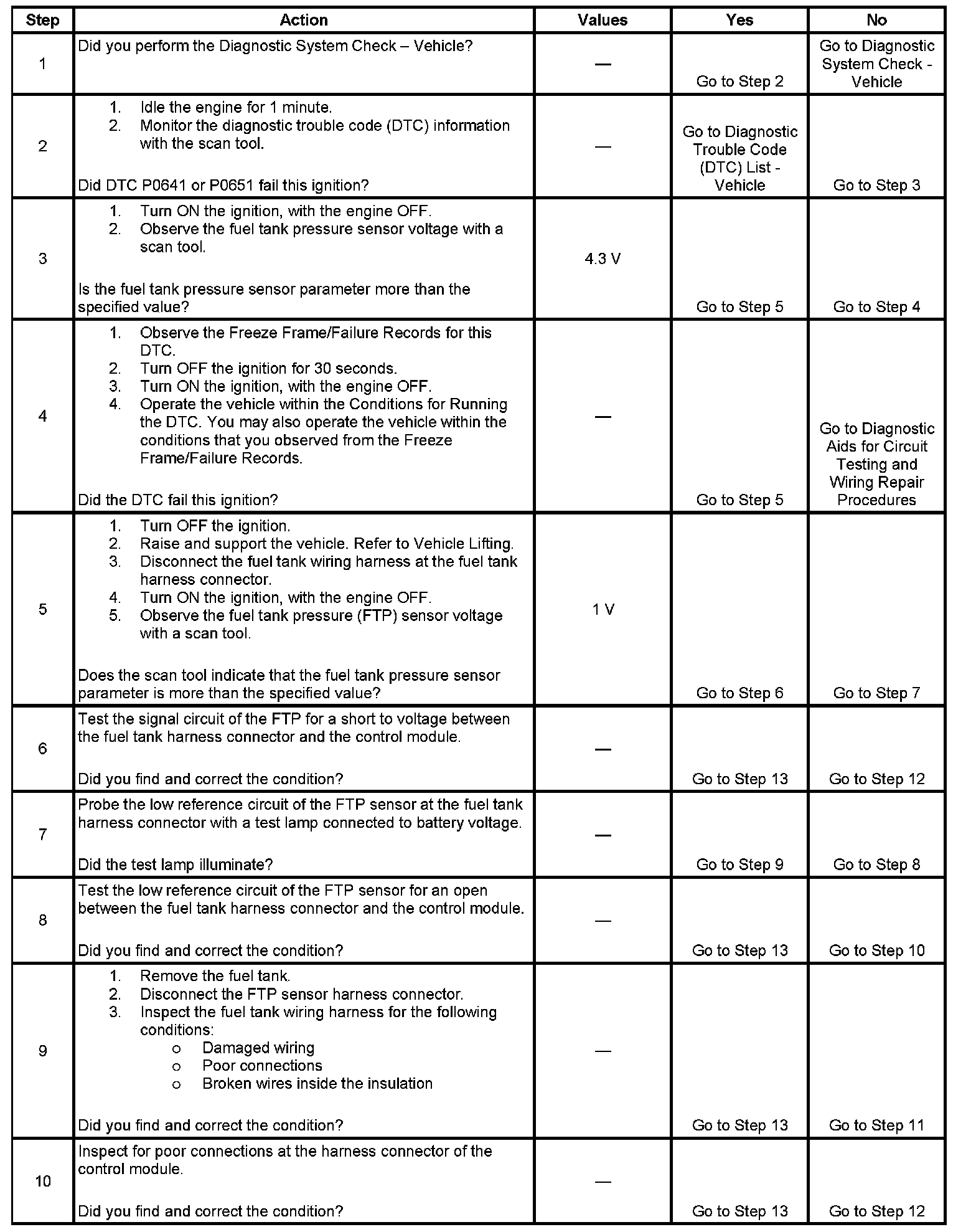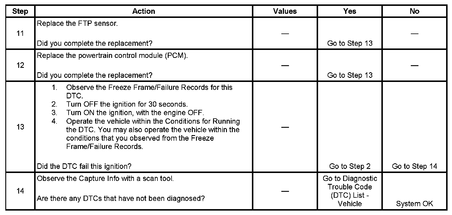 The fuel tank pressure (FTP) sensor measures the difference between the air pressure or vacuum in the evaporative emission (EVAP) system, and the outside air pressure. The control module supplies a 5-volt reference and a low reference circuit to the FTP sensor. The FTP sensor signal circuit voltage varies depending on EVAP system pressure or vacuum. If the FTP sensor signal voltage increases above a calibrated value, this DTC sets.