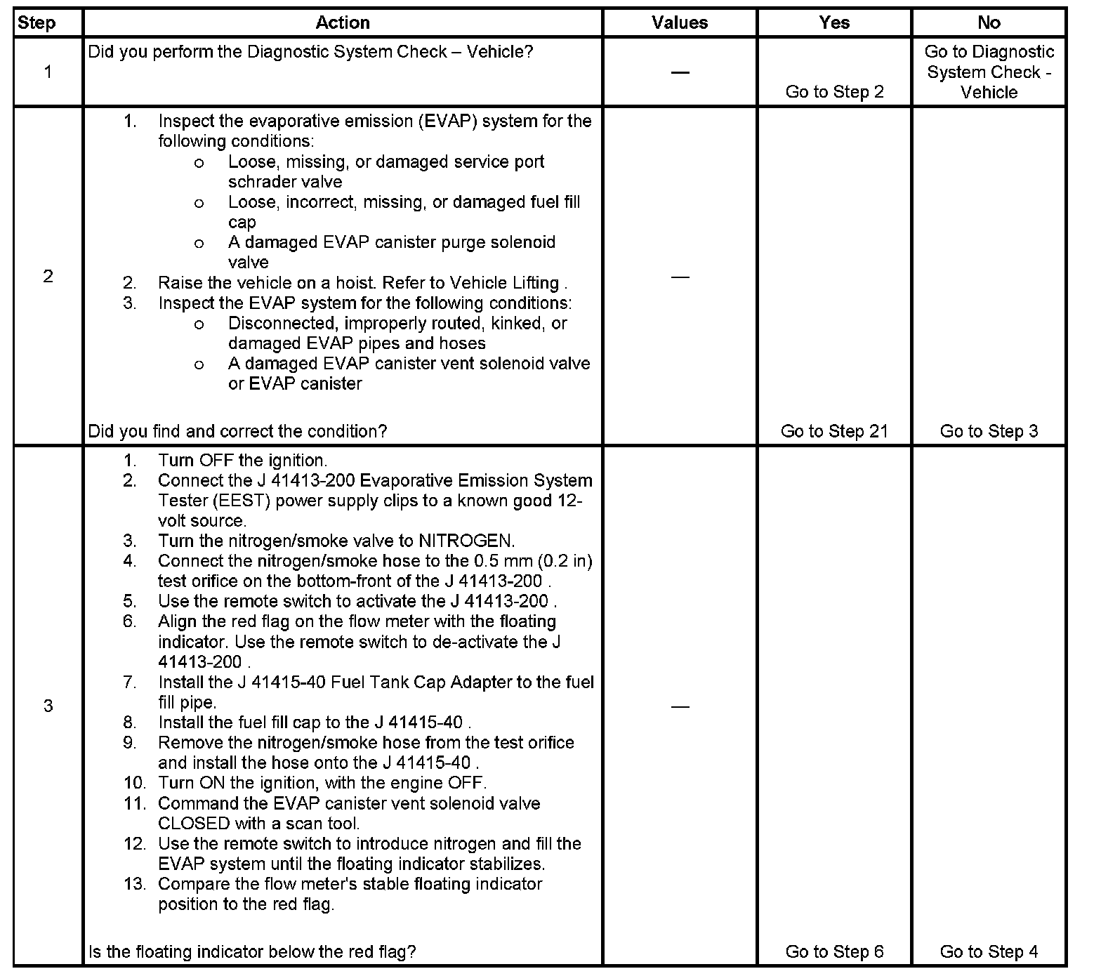 The control module tests the evaporative emission (EVAP) system for a large leak. The control module monitors the fuel tank pressure (FTP) sensor signal to determine the EVAP system vacuum level. When the conditions for running are met, the control module commands the EVAP canister purge solenoid valve open and the EVAP canister vent solenoid valve closed. This allows engine vacuum to enter the EVAP system. At a calibrated time, or vacuum level, the control module commands the EVAP canister purge solenoid valve closed, sealing the system, and monitors the FTP sensor input in order to determine the EVAP system vacuum level. If the system is unable to achieve the calibrated vacuum level, or the vacuum level decreases too rapidly, this DTC sets.