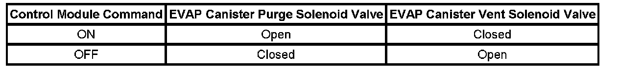 The table illustrates the relationship between the ON and OFF states, and the Open or Closed states of the EVAP canister purge and vent solenoid valves.