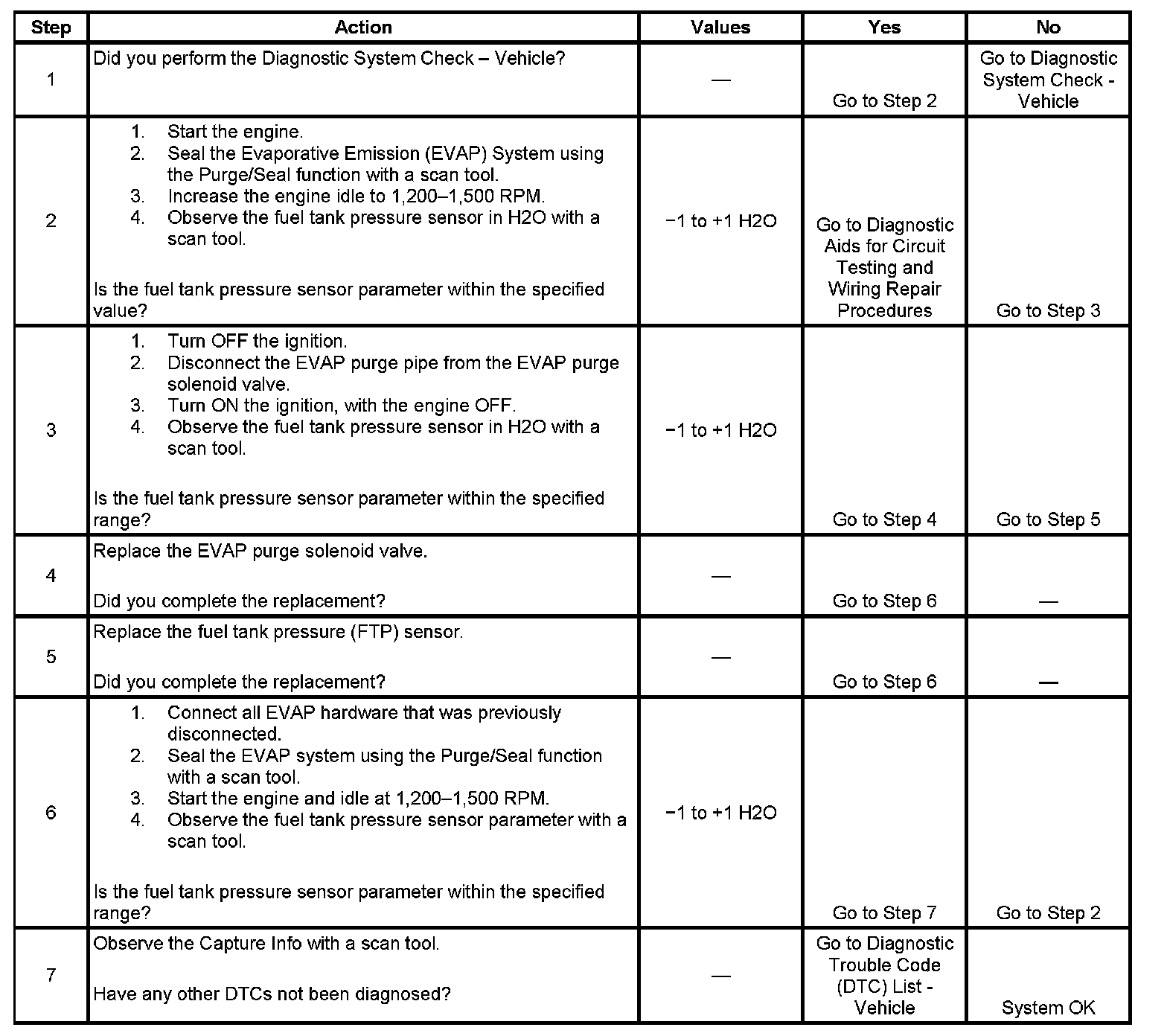 This DTC tests for undesired intake manifold vacuum flow to the Evaporative Emission (EVAP) System. The control module seals the EVAP system by commanding the EVAP canister purge solenoid valve Closed and the EVAP canister vent solenoid valve Closed. The control module monitors the fuel tank pressure (FTP) sensor to determine if a vacuum is being drawn on the EVAP system. If vacuum in the EVAP system is more than a predetermined value within a predetermined time, this DTC sets.