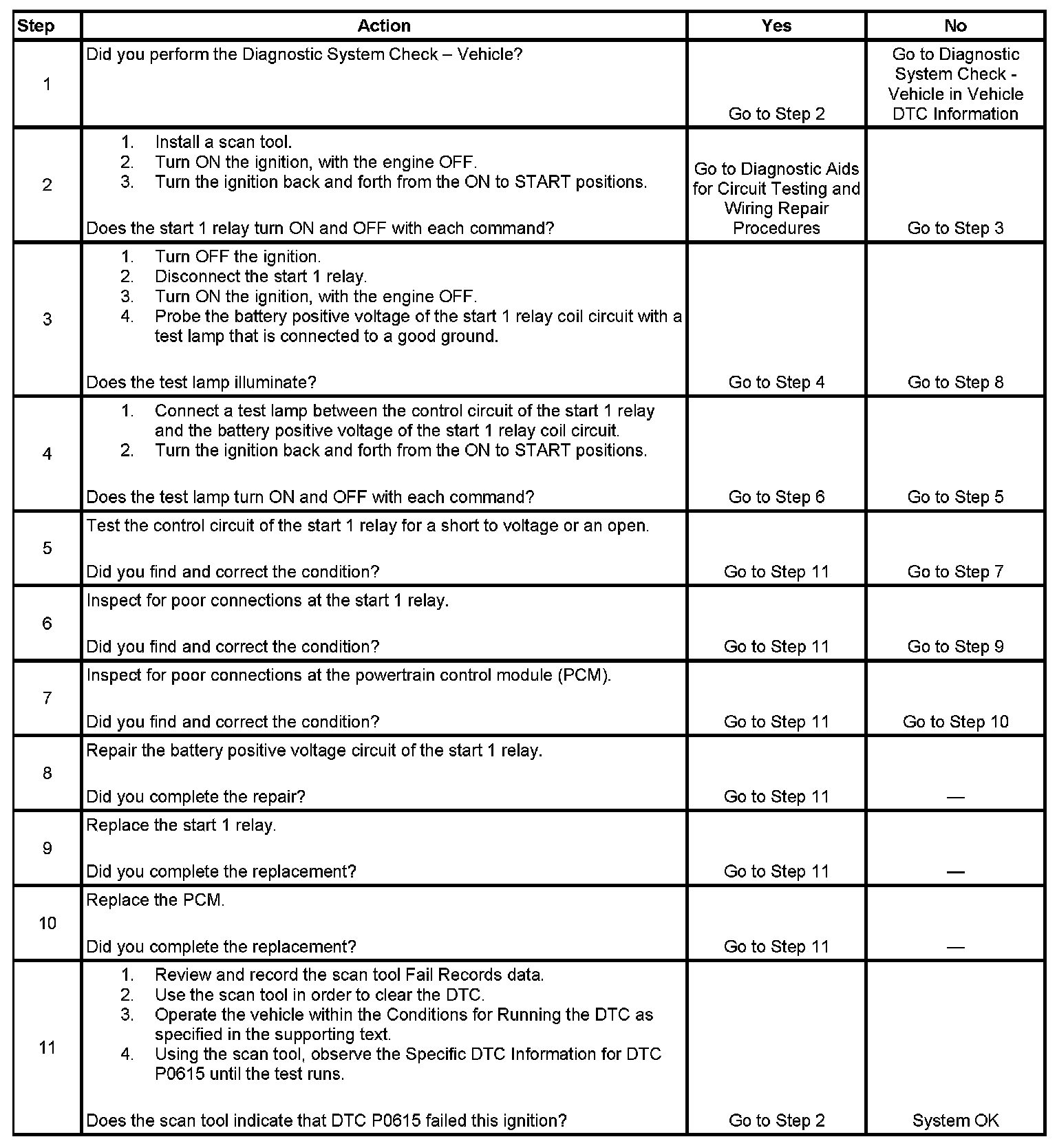 The powertrain control module (PCM) uses output driver modules (ODMs) to control many functions of the engine. The ODMs supply the ground path for the PCM controlled device when the PCM commands the device ON. Each ODM is able to control several outputs. The PCM monitors the ODMs for circuit conditions that are incorrect for the commanded state of the ODM. If the PCM detects an improper circuit condition in the ODM that controls the starter relay, DTC P0615 will set.