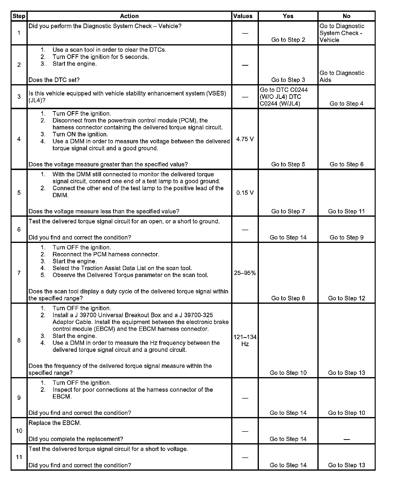 The EBCM supplies 5 VDC to the powertrain control module (PCM) on the delivered torque signal circuit. The PCM toggles this voltage to ground in order to create the delivered torque signal at the EBCM. A signal with a frequency of 128 Hz +/- 5 percent and a duty cycle of 25 - 95 percent is a valid delivered torque signal. The percentage of duty cycle is proportionate to the percentage of delivered torque.