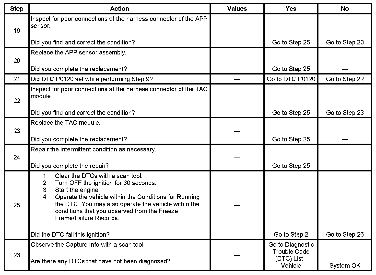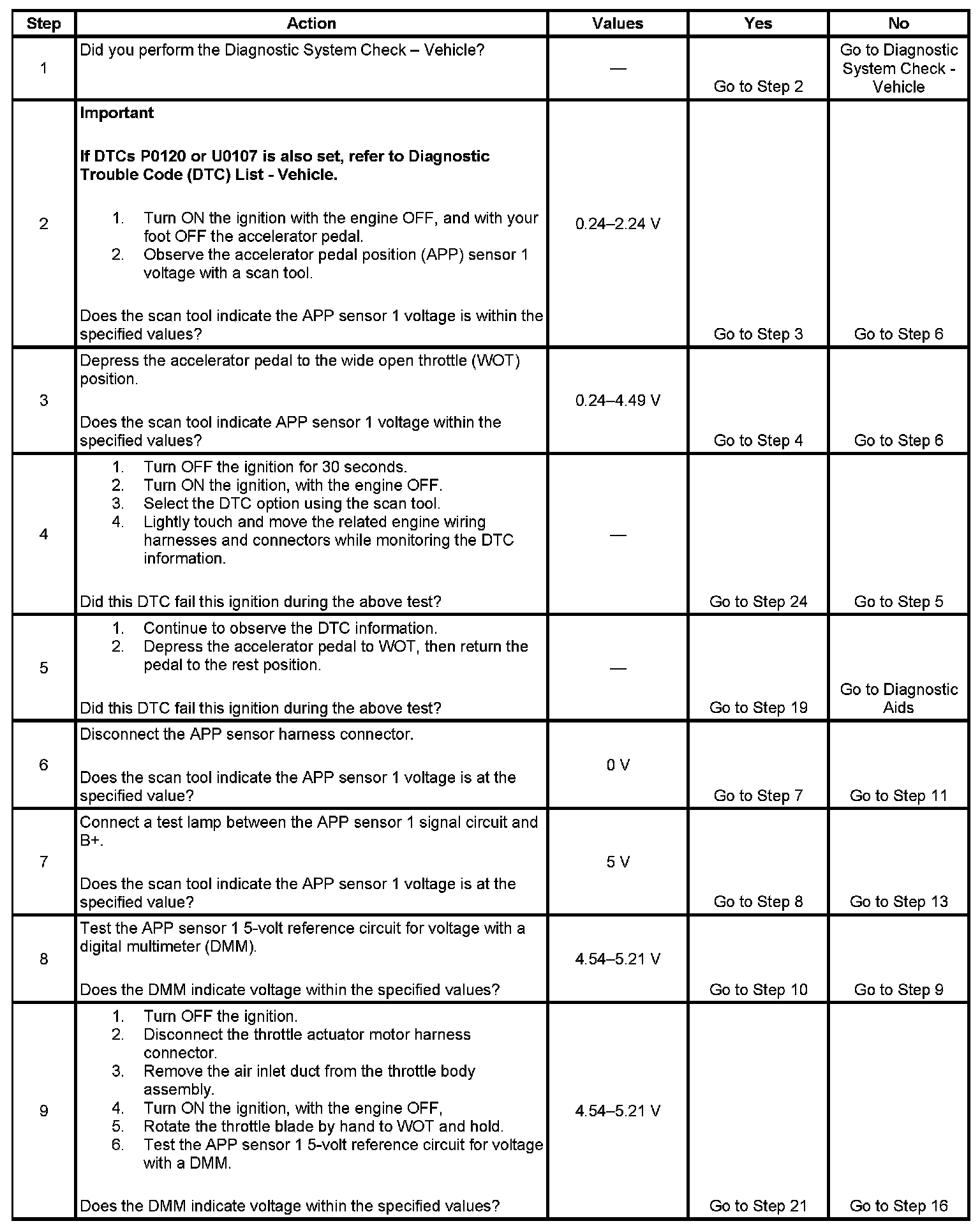 If the PCM detects one or more of the APP sensor 1 tests are out of range, DTC P2120 sets.