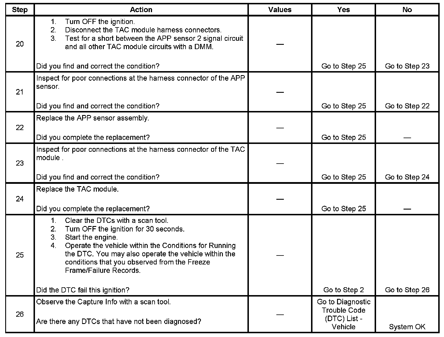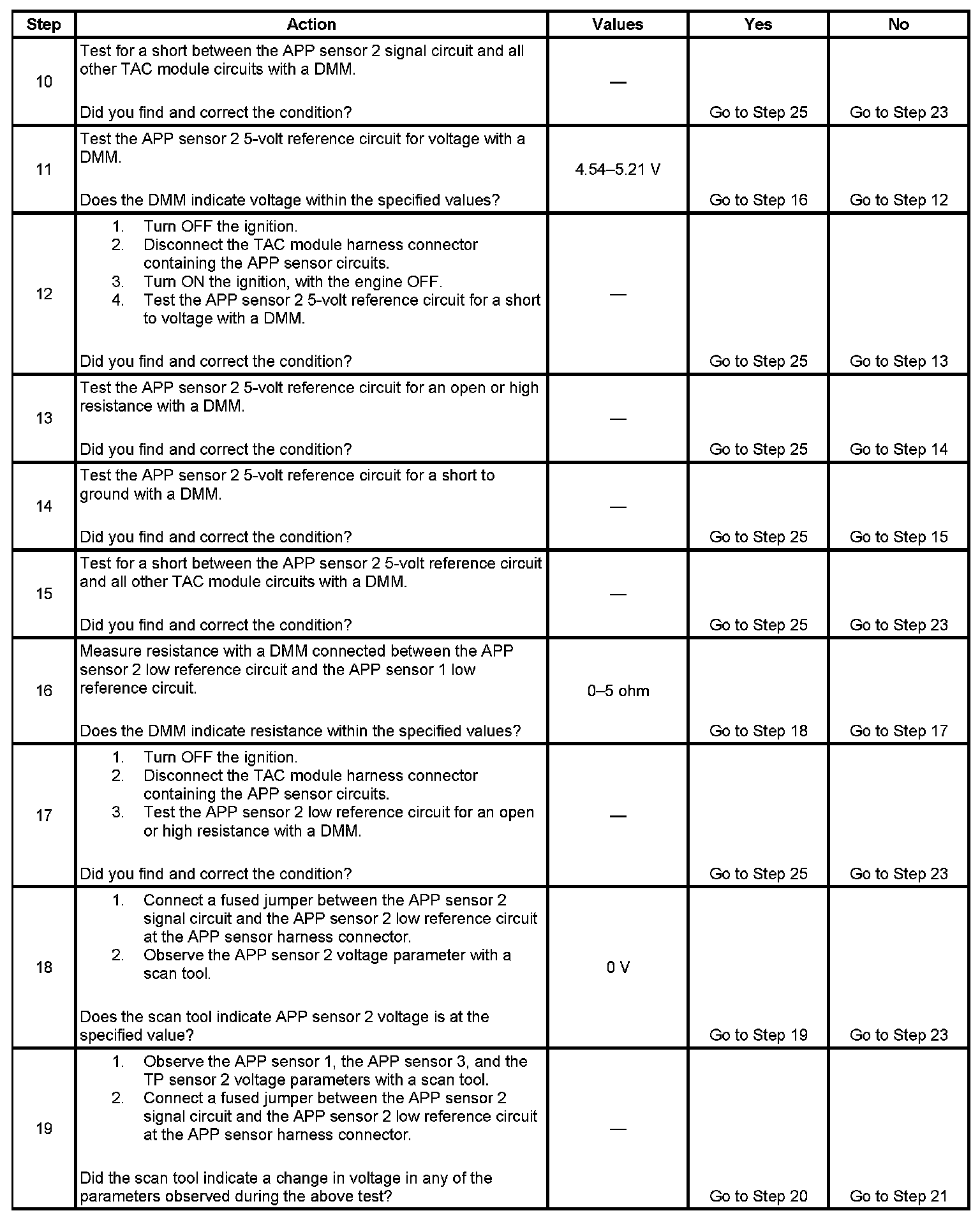 19. There are 2 separate 5-volt reference sources within the TAC module. The TP sensor 1 and the APP sensor 1 share one 5-volt reference source. The TP sensor 2 and the APP sensor 2 share another common 5-volt reference source. This test determines whether the signal circuit is shorted to any one of the 5-volt reference circuits. If a short exists, the corresponding sensor voltage will be pulled low.