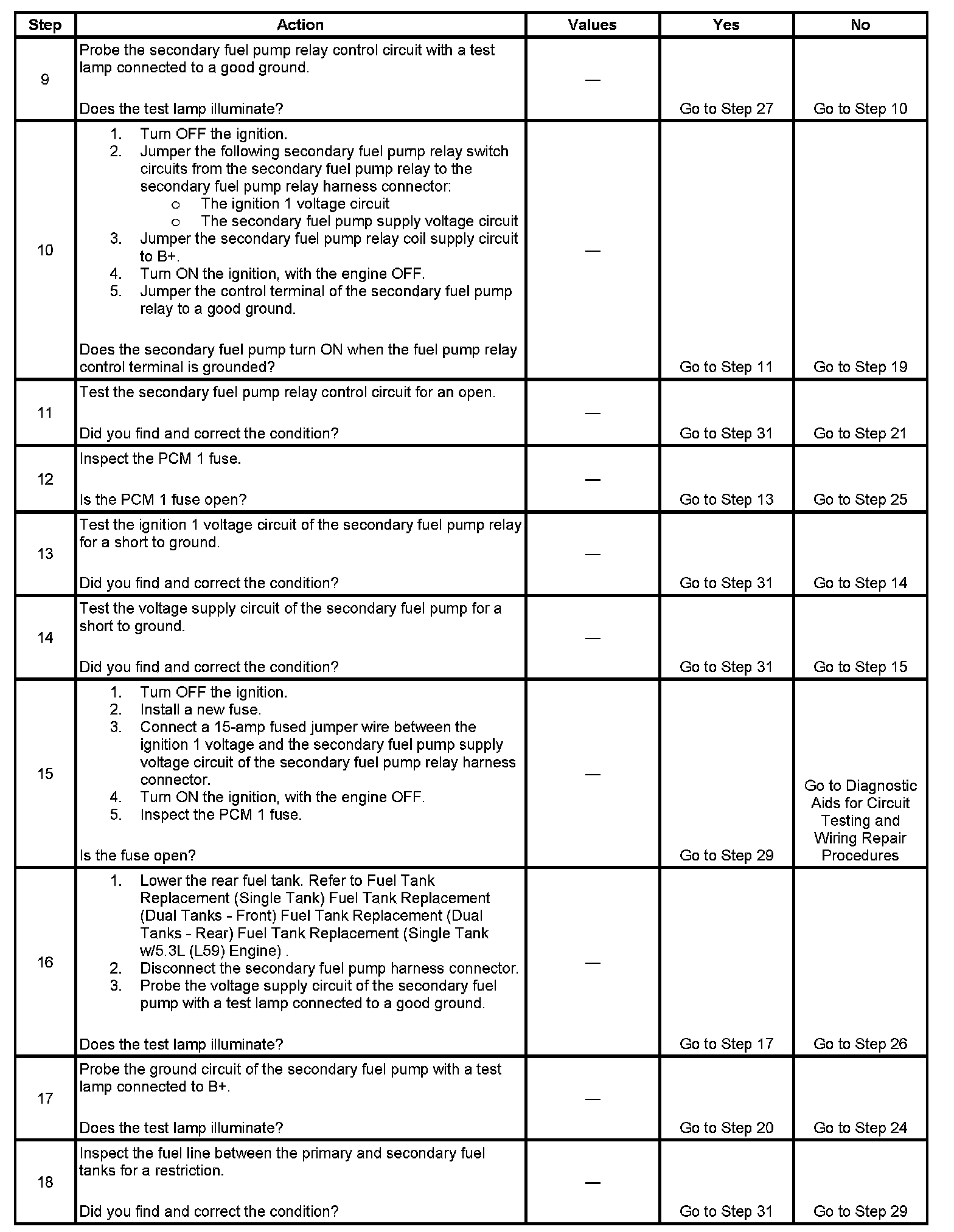 9. This step tests for a short to voltage on the control circuit of the secondary fuel pump relay. If the test lamp illuminates, a short to voltage is indicated.