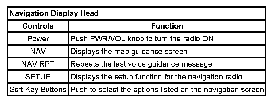 This component acts as the operator interface for the audio system, provides the data input from the operator to the navigation system and provides navigation information to the operator via the display screen. The navigation radio, located in the center of the instrument panel, provides the following: