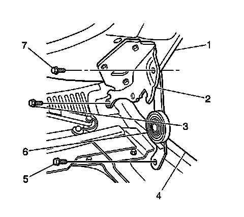 2. Remove the bolts (7) holding the hood link assembly to the hood hinge.