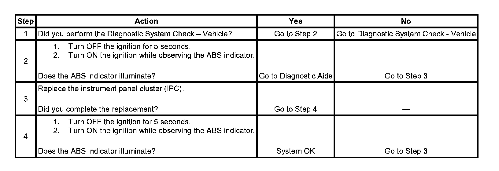 Replace the Instrument Panel Cluster if the ABS indicator intermittently fails to operate during the bulb check.