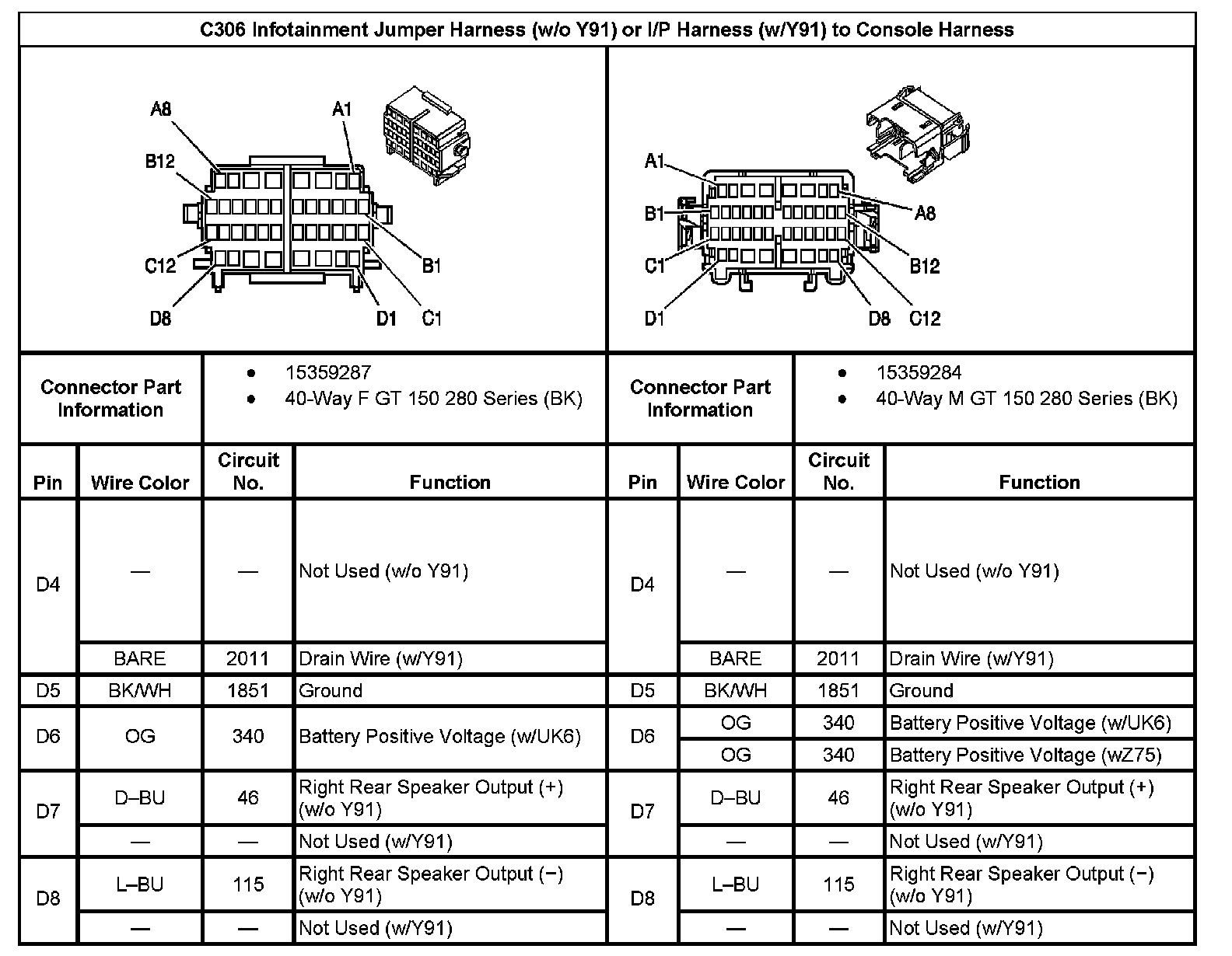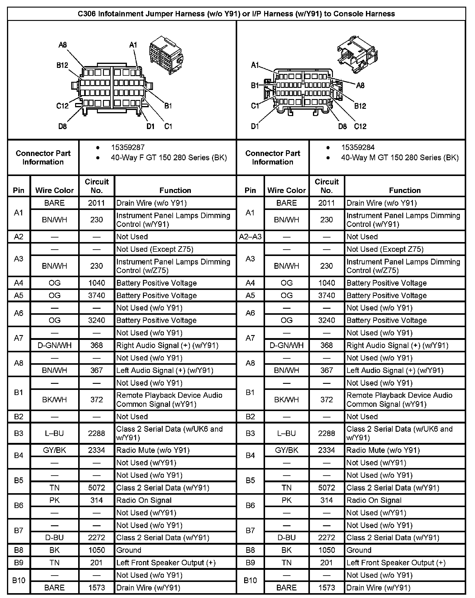 C306 Infotainment Jumper Harness (Without RPO Code Y91) Or I/P Harness (With RPO Code Y91) To Console Harness (Part 1)C306 Infotainment Jumper Harness (Without RPO Code Y91) Or I/P Harness (With RPO Code Y91) To Console Harness (Part 2):