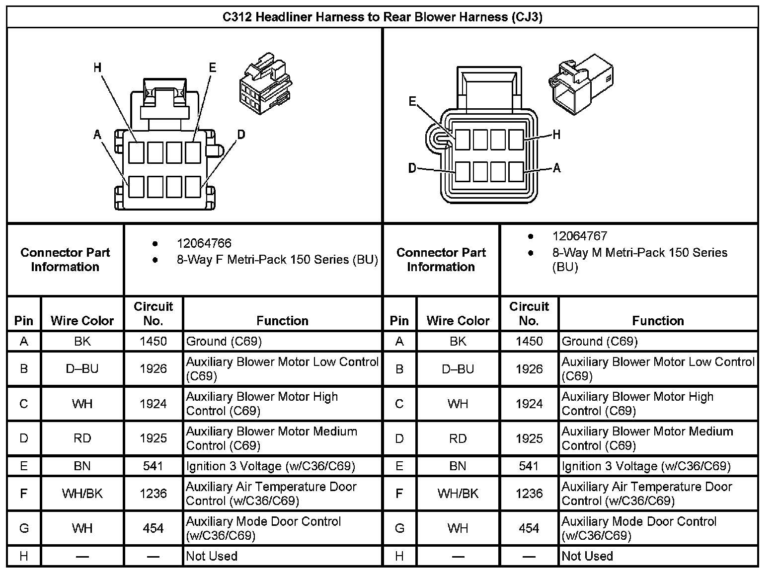 C312 Headliner Harness To Rear Blower Harness (With RPO Code CJ3):