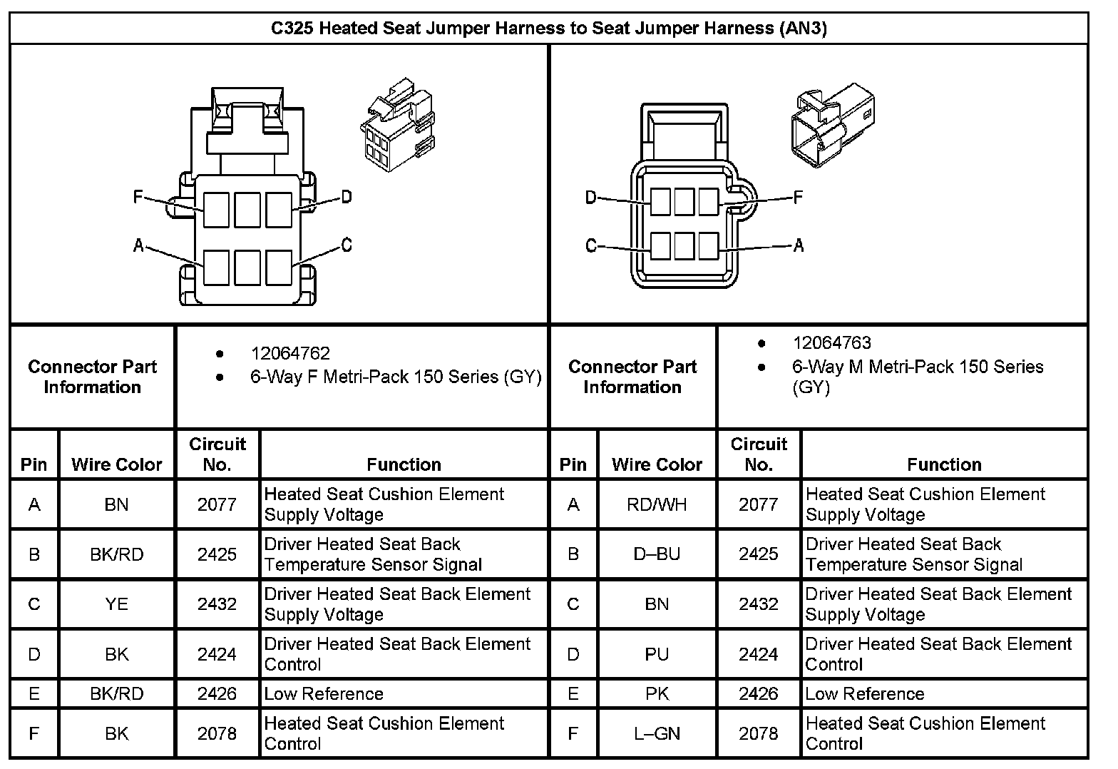 C325 Heated Seat Jumper Harness To Seat Jumper Harness (With RPO Code AN3):
