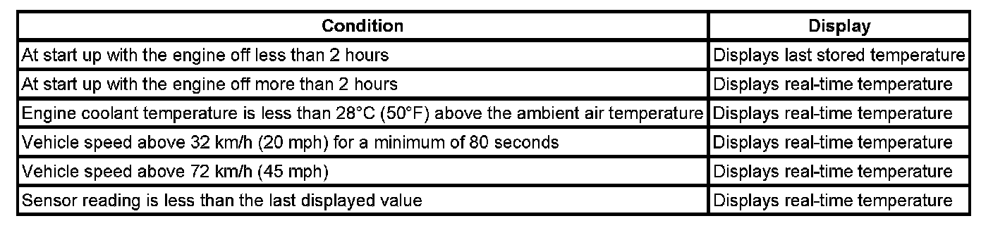 The ambient air temperature sensor mounts underhood and can be affected by city traffic, by idling, and by restarting a hot engine. Therefore, the HVAC control module filters the value of the ambient air temperature sensor for temperature display. The ambient air temperature value is updated under the conditions.