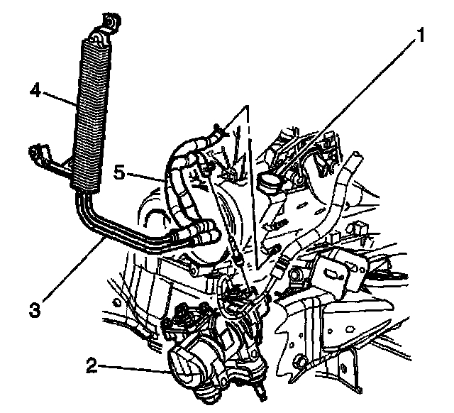 5. Remove the clamp retaining power steering cooler outlet hose (5) to the power steering pump (1).