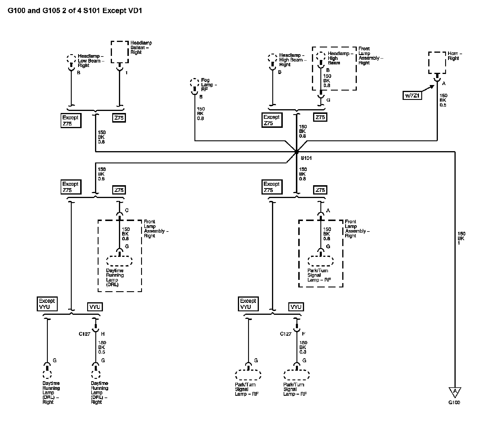 The locations for the Connectors, Grounds, Splices, and Grommets shown within these diagrams can be found via their numbers at Vehicle Locations.