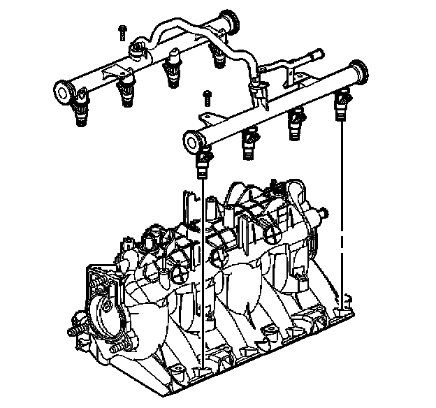 - Remove the fuel rail assembly carefully in order to prevent damage to the injector electrical connector terminals and the injector spray tips. Support the fuel rail after the fuel rail is removed in order to avoid damaging the fuel rail components.