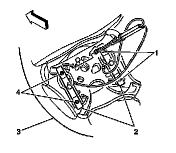 4. Disconnect the captured screws (1,4) to the horn contact plate (2) from the steering wheel (3).
