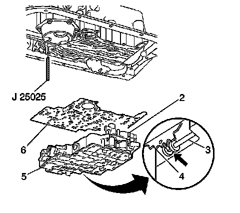 11. Install the valve body (5). Attach the manual valve to the detent lever while installing the valve body.