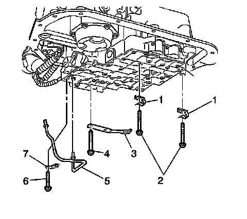 5. Remove the valve body bolts (1) that retain the (TFP) manual valve position switch (2).