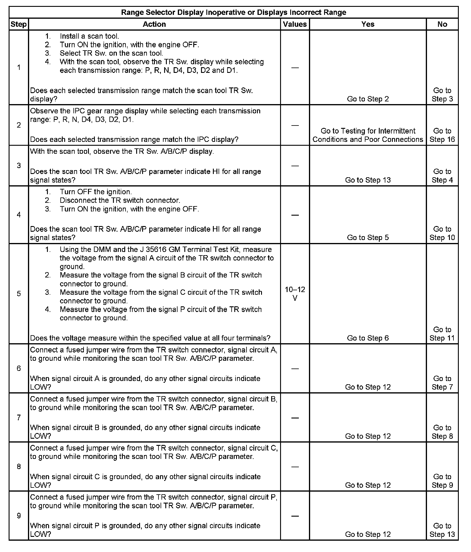 9. This step tests the TR switch wiring and the PCM by providing a ground path through a fused jumper wire. When grounded, the scan tool range signal states should change to LOW.