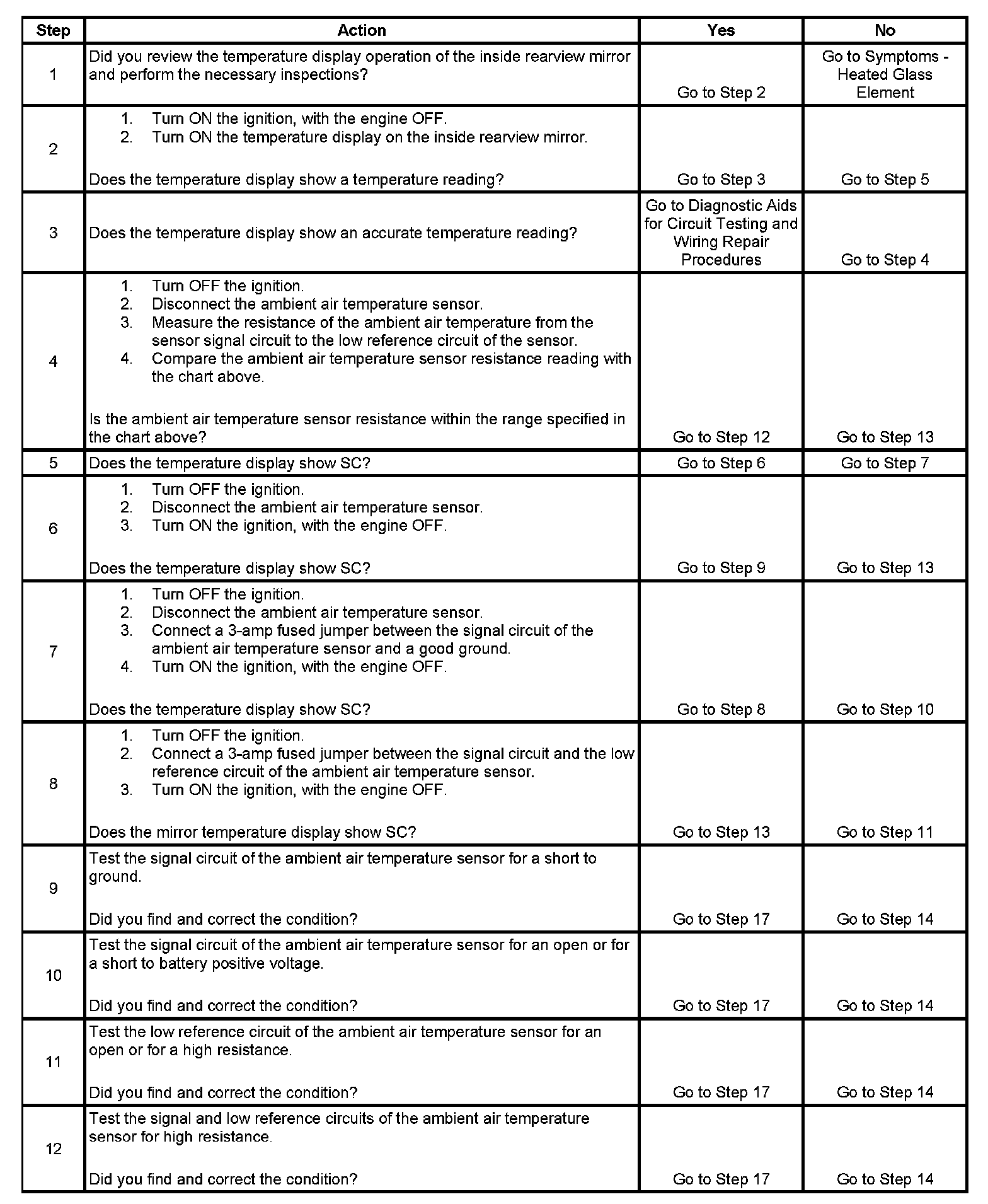 The table will be used to measure the resistance of the sensor and compare it with the actual ambient temperature. The mirror's temperature accuracy should be within 5 degrees of the actual temperature. The actual temperature should not be taken from a radio station, a sign displaying the temperature, etc. A temperature measuring tool such as a thermometer should be used. Some temperature measuring tools may be within 5 degrees of the actual temperature. Make sure to consult the manufacturer for the accuracy of the tool. This comparison can make the mirror seem off by 5-10 degrees of the actual temperature when it is not.