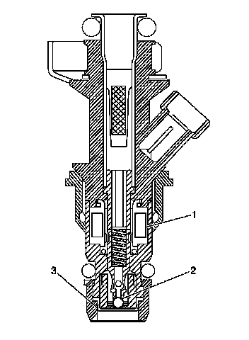 The Multec 2 fuel injector assembly is a solenoid operated device, controlled by the powertrain control module (PCM), that meters pressurized fuel to a single engine cylinder. The PCM energizes the high-impedance (12.2 ohms) injector solenoid (1) to open a normally closed ball valve (2). This allows fuel to flow into the top of the injector, past the ball valve, and through a director plate (3) at the injector outlet. The director plate has 2 machined holes that control the fuel flow, generating a spray of finely atomized fuel at the injector tip. Fuel from the injector tip is directed at the intake valve, causing it to become further atomized and vaporized before entering the combustion chamber. An injector stuck partly open can cause a loss of pressure after engine shutdown. Consequently, long cranking times would be noticed on some engines.