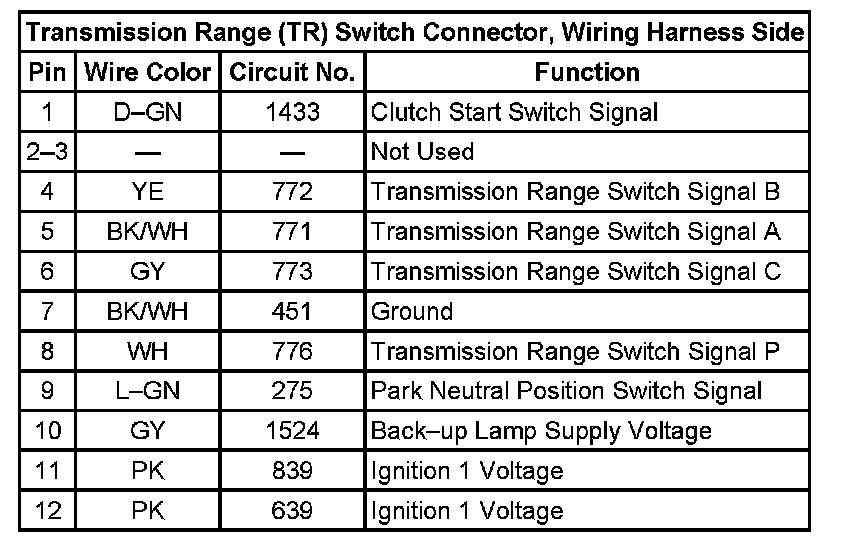 Transmission Range (TR) Switch Connector, Wiring Harness Side: