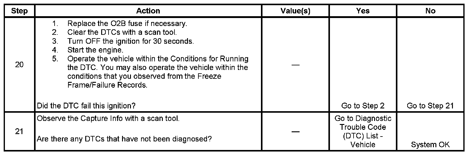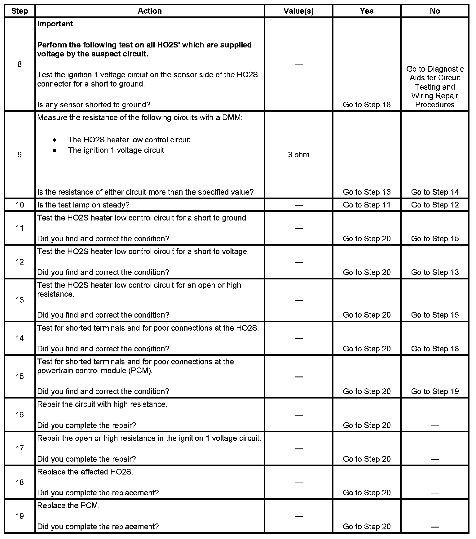 The heated oxygen sensor (HO2S) must reach operating temperature to provide an accurate voltage signal. A heating element inside the HO2S minimizes the time required for the sensor to reach operating temperature. Voltage is provided to the heater by the ignition 1 voltage circuit through a fuse. With the engine running, ground is provided to the heater by the HO2S heater low control circuit, through a low side driver within the powertrain control module (PCM). The PCM commands the heater ON or OFF to maintain a specific HO2S operating temperature range. The PCM determines the temperature by measuring the current flow through the heater. When the heater is in the ON state, the PCM will pulse the heater OFF for a duration of 50 ms, once per second. When the heater is in the OFF state, the PCM will pulse the heater ON for a duration of 50 ms, once per second. The PCM calculates the heater resistance on a cold start. This diagnostic will only run once per ignition cycle. If the PCM detects that the heater calculated resistance is not within an expected range, DTC P0054 sets for HO2S bank 1 sensor 2, or DTC P0060 sets for HO2S bank 2 sensor 2.