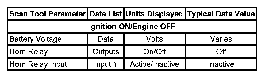The Horns Scan Tool Data List contains all horn related parameters that are available on the scan tool. The parameters in the list are arranged in alphabetical order. The column, Data List, indicates the location of the parameter within the scan tool menu selections. Use the Horns Scan Tool Data List as directed by a diagnostic table or in order to supplement the diagnostic procedures. Begin all of the diagnostic procedures with Diagnostic System Check - Vehicle. Testing and Inspection