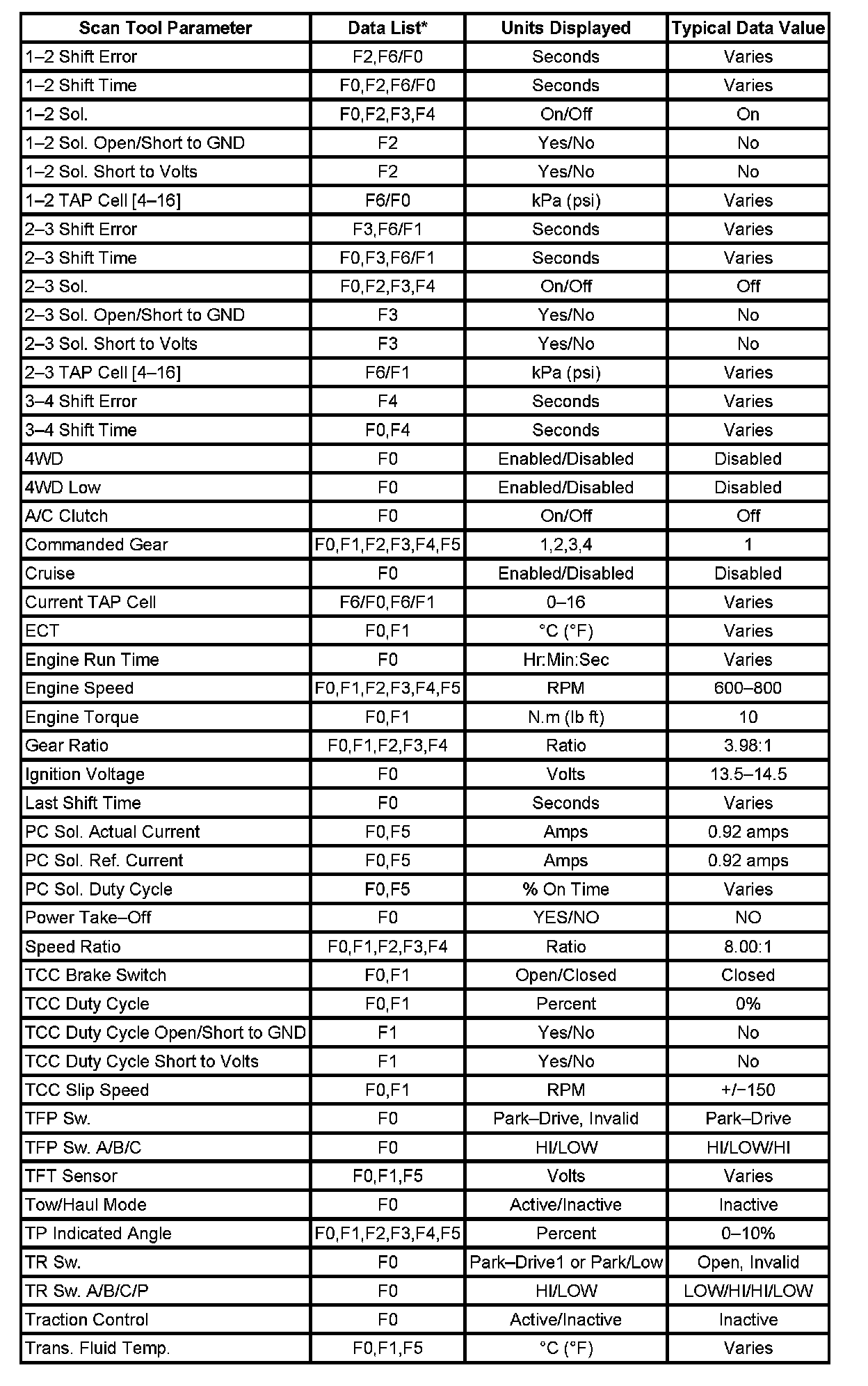 Only the parameters listed below are used in this manual for diagnosing. If a scan tool displays other parameters, the values are not recommended by General Motors for use in diagnosis.