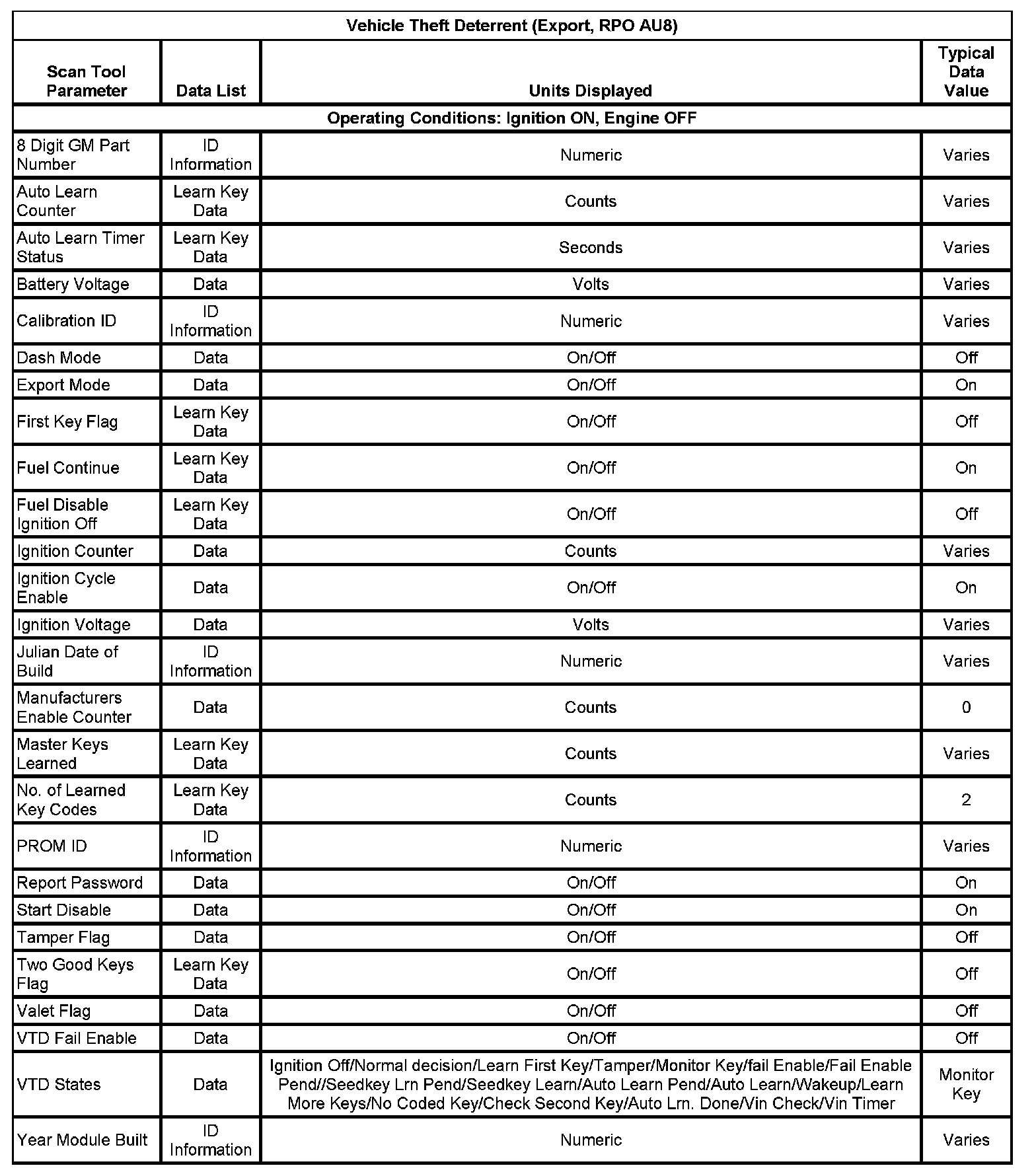 Vehicle Theft Deterrent (Export, With RPO Code AU8):