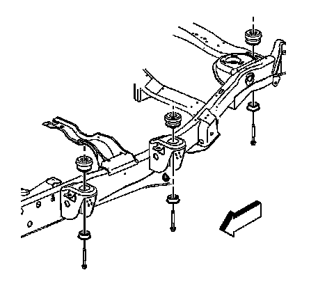 4. Remove the body mount bolt, retainers, and lower cushions at the front mount location.
