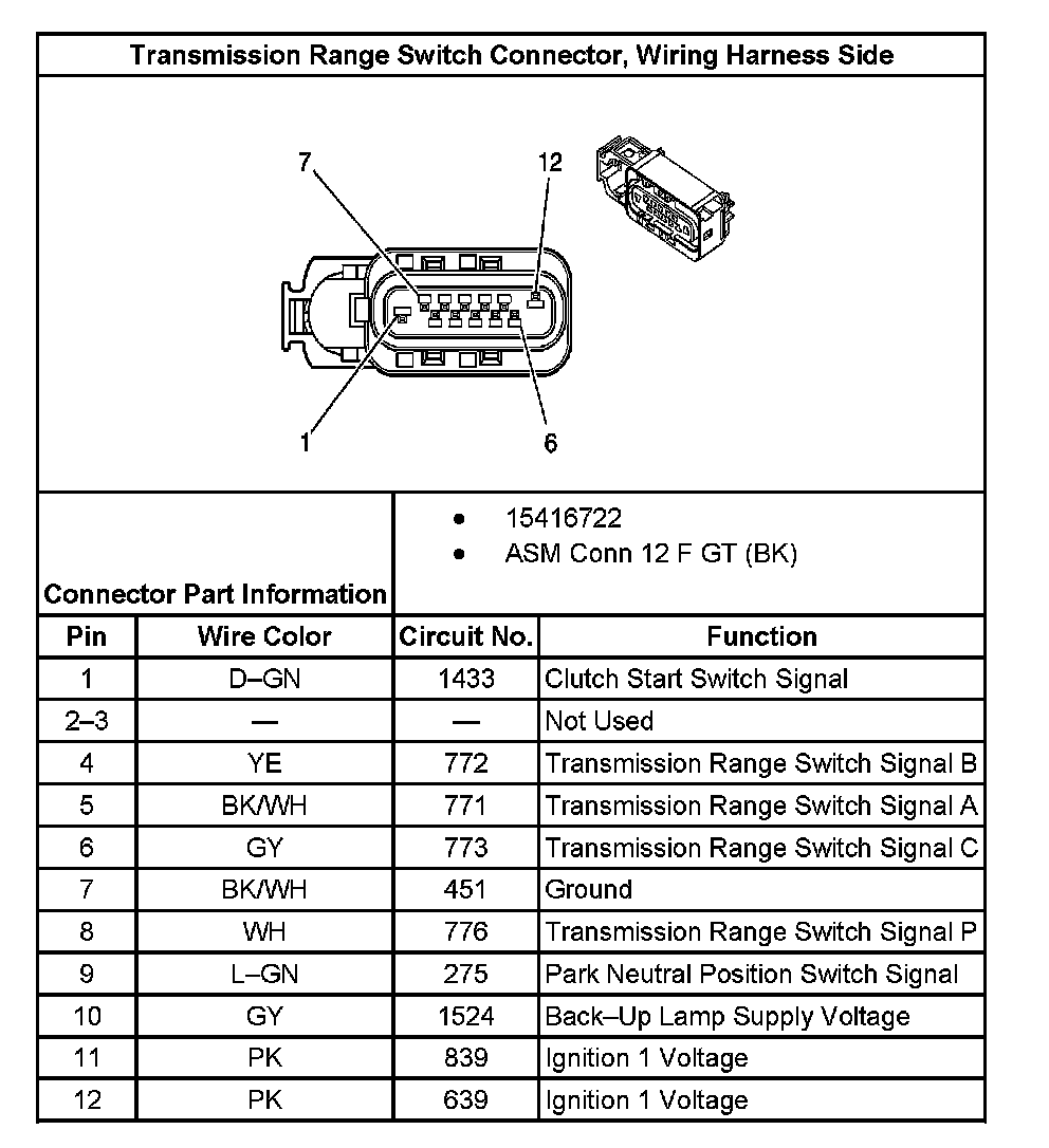 Transmission Range Switch Connector, Wiring Harness Side: