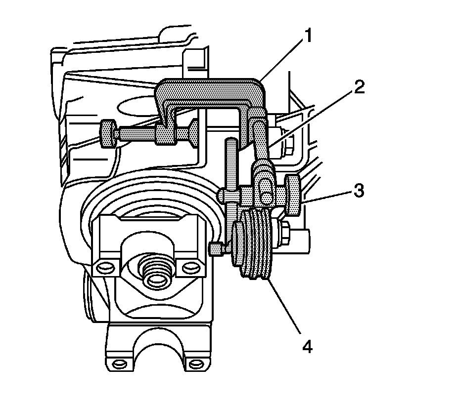 2. Install the J 8001-1 (1, 2), the J 8001-2 (3), and the J 8001-3 (4) as shown. Ensure that the button contacts the outer edge of the pinion yoke and that the plunger is at a right angle to the pinion yoke.