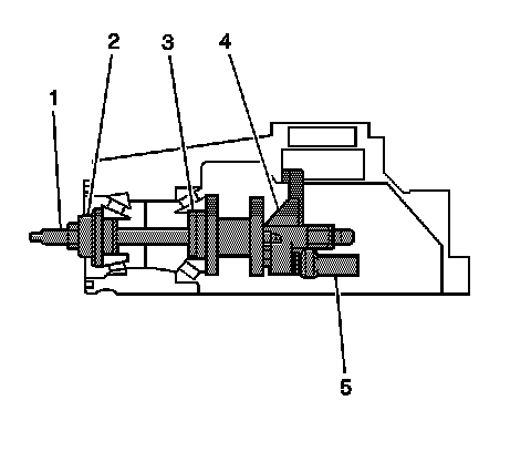 6. Insert the J 36601-7 (1) with the J 21777-35 or the J 21777-8 (3) through the inner pinion bearing and the differential carrier case half.