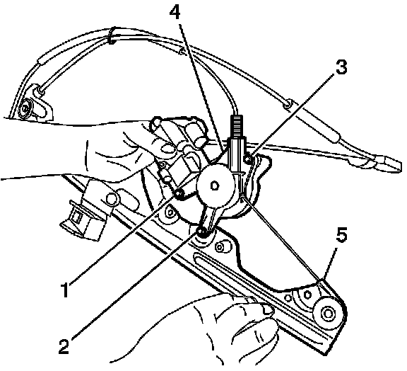 3. With the window regulator on the bench, remove fasteners one (1) and two (2) which will disconnect the drive housing and motor (4) from the rail (5).