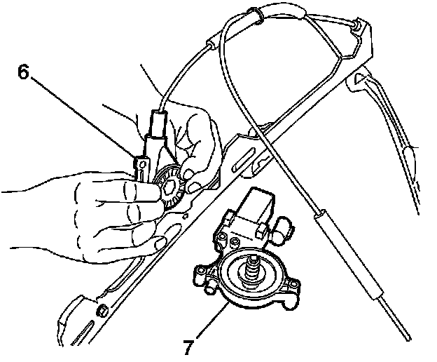 5. Slide the motor partially out of the gear/spool allowing finger access to the gear spool (6). Hold the gear/spool into the housing and remove the motor (7).