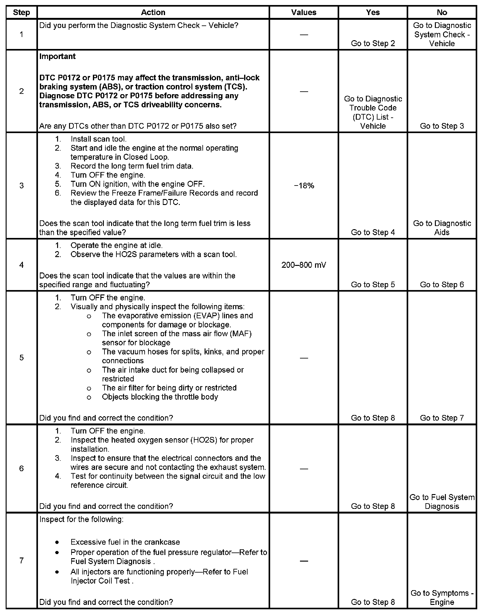 The powertrain control module (PCM) controls the air/fuel metering system in order to provide the best possible combination of driveability, fuel economy, and emission control. Fuel delivery is controlled differently during Open and Closed Loop. During Open Loop, the PCM determines fuel delivery based on sensor signals without oxygen sensor input. During Closed Loop, the PCM adds oxygen sensor inputs and level of purge to calculate short and long term fuel trim adjustments. If the oxygen sensors indicated a lean condition, fuel trim values will be above 0 percent. If the oxygen sensors indicate a rich condition, fuel trim values will be below 0 percent. The values for the short term fuel trim change rapidly in response to the heated oxygen sensor (HO2S) voltage signals. Long term fuel trim makes coarse adjustments in order to maintain an air/fuel ratio of 14.7:1. A block of cells contain information arranged in combinations of engine RPM and engine load for a fuel range of vehicle operating conditions. The long term fuel trim diagnostic is based on an average of cells currently being used. The PCM selects the cells based on the engine speed and engine load. The fuel trim diagnostic will conduct a test to determine if a rich failure actually exists, or if excessive vapor from the evaporative emission (EVAP) canister is causing a rich condition. If the PCM detects an excessively rich condition, DTC P0172 or P0175 sets.