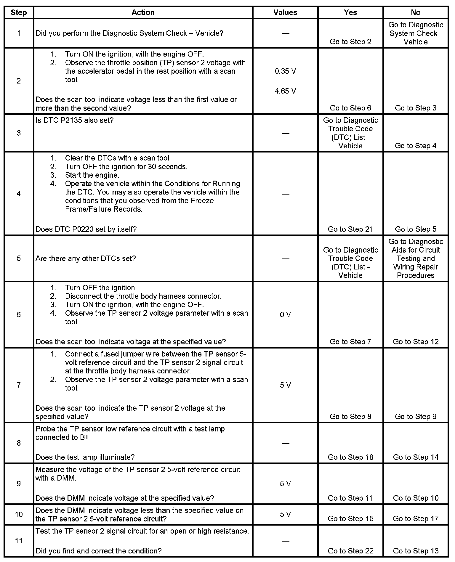 This provides the engine control module (ECM) with a signal voltage proportional to throttle plate movement. TP sensor 1 signal voltage at closed throttle is near the 5-volt reference and decreases as the throttle plate is opened. TP sensor 2 signal voltage at closed throttle is near the low reference and increases as the throttle plate is opened. If the ECM detects the TP sensor 2 signal voltage is not within the predicted range, DTC P0220 sets.
