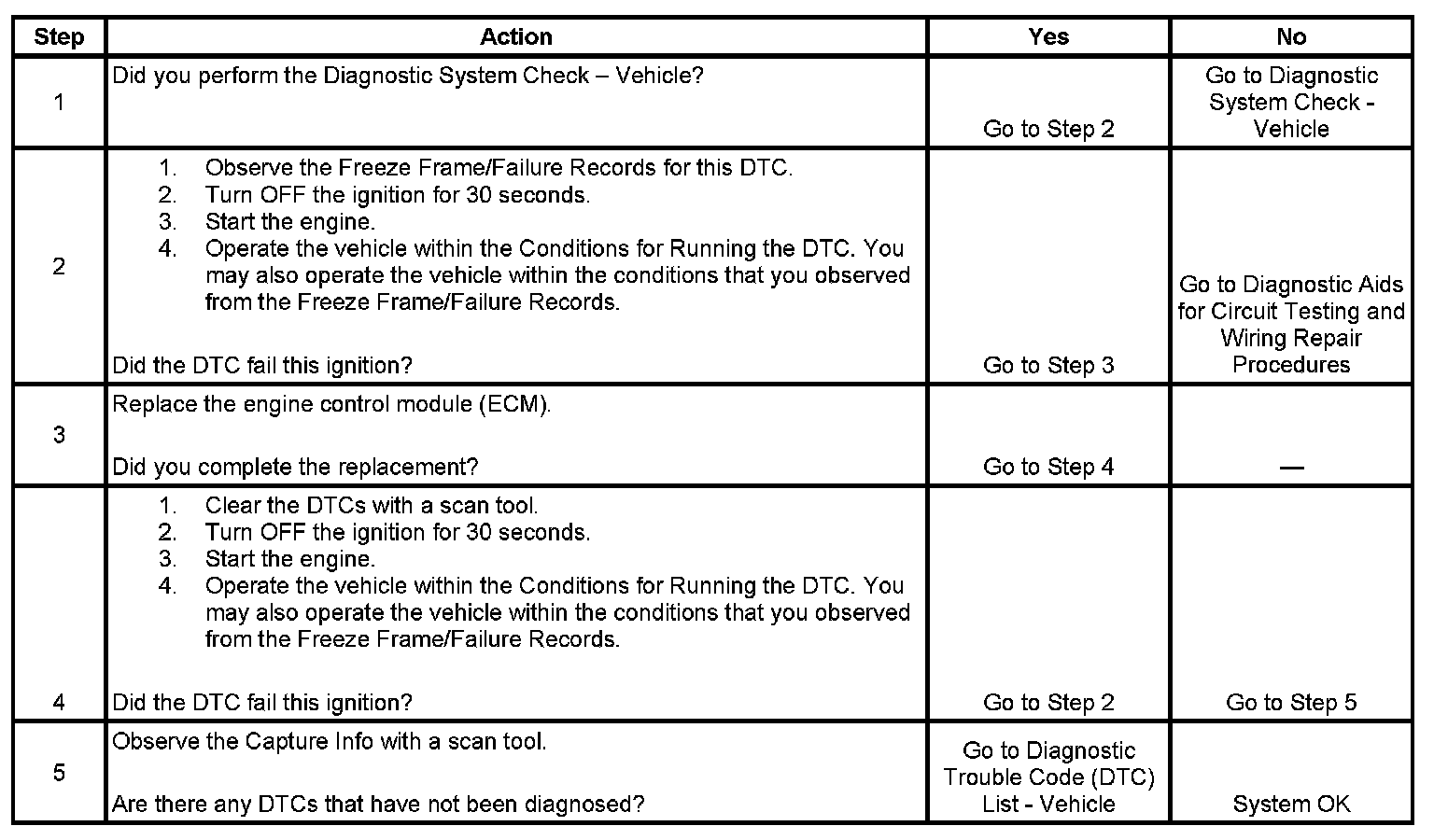 - The control module records the operating conditions at the time the diagnostic fails. The first time the diagnostic fails, the control module stores this information in the Failure Records. If the diagnostic reports a failure on the second consecutive ignition cycle, the control module records the operating conditions at the time of failure. The control module writes the operating conditions to the Freeze Frame and updates the Failure Records.